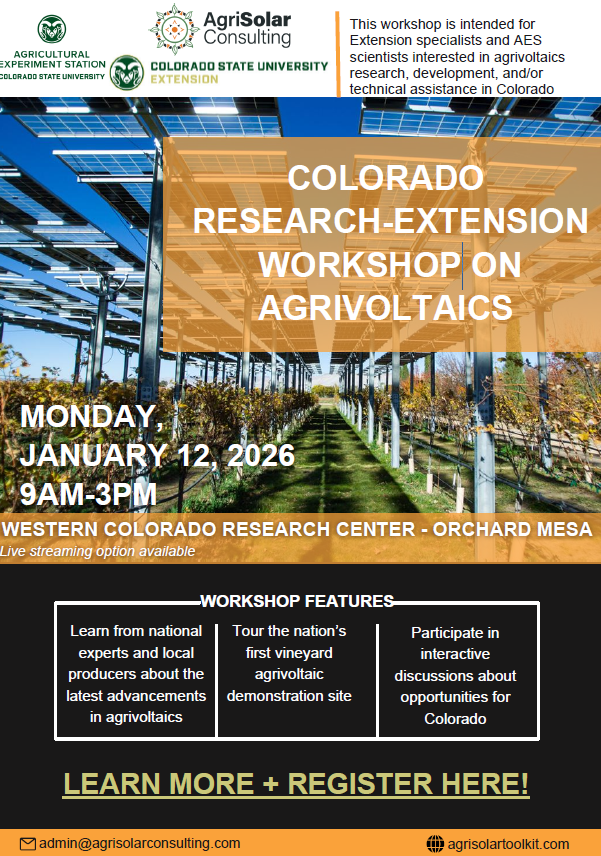Join Colorado State University Extension, Agricultural Experiment Station, and AgriSolar for a workshop on Agrivoltaics. Live streaming of the workshop is available upon request. Click the link below to learn more and to register!