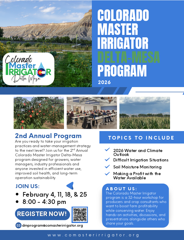 The Colorado Master Irrigator Delta-Mesa program is returning in 2026! Ready to take your irrigation practices and water management strategy to the next level? Join us for 4 days in February to learn about efficient irrigation, soil moisture monitoring, and much more!