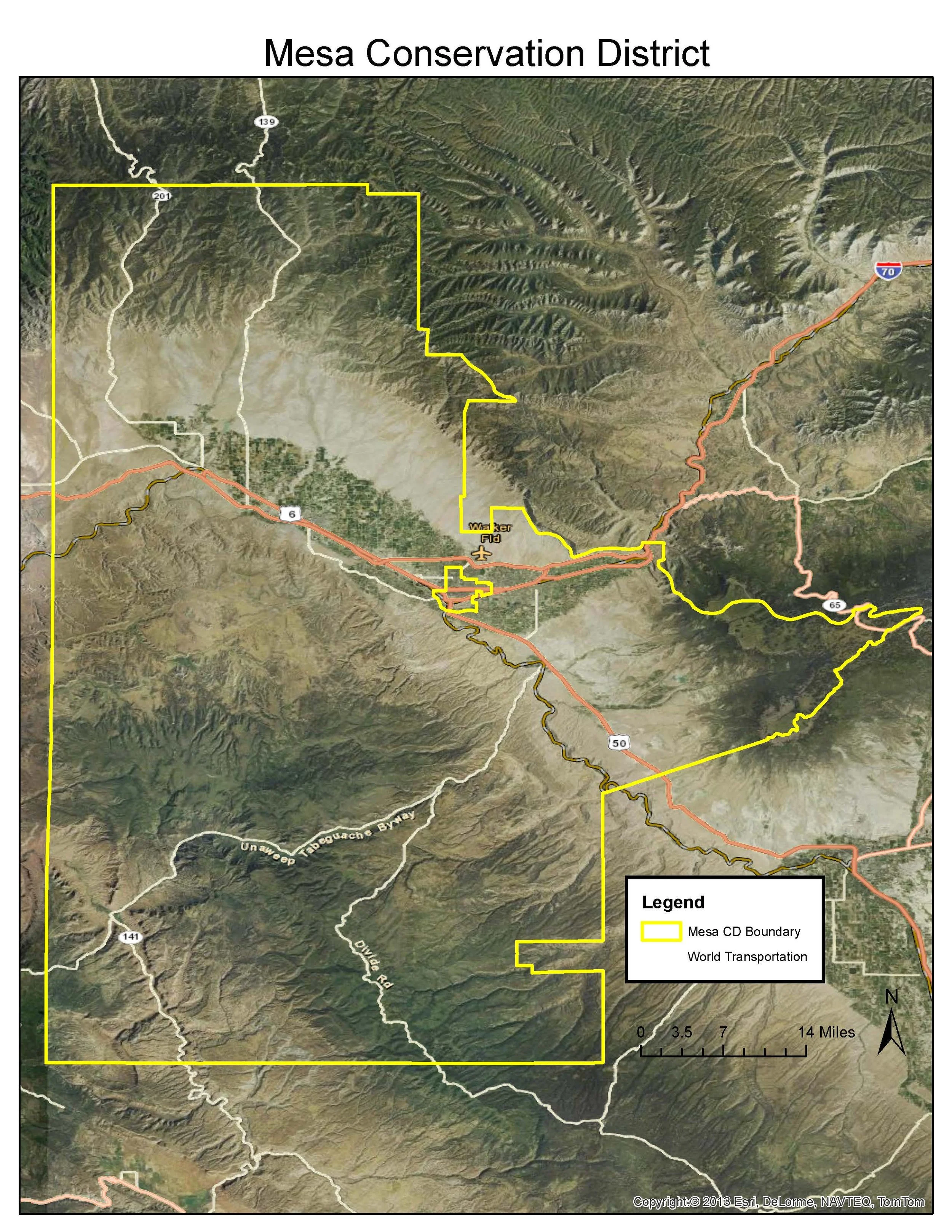 Mesa Conservation District encompasses everything within the yellow boundary on the map. The only exception is a small area within the city of Grand Junction, as shown.